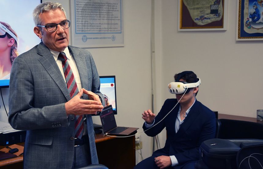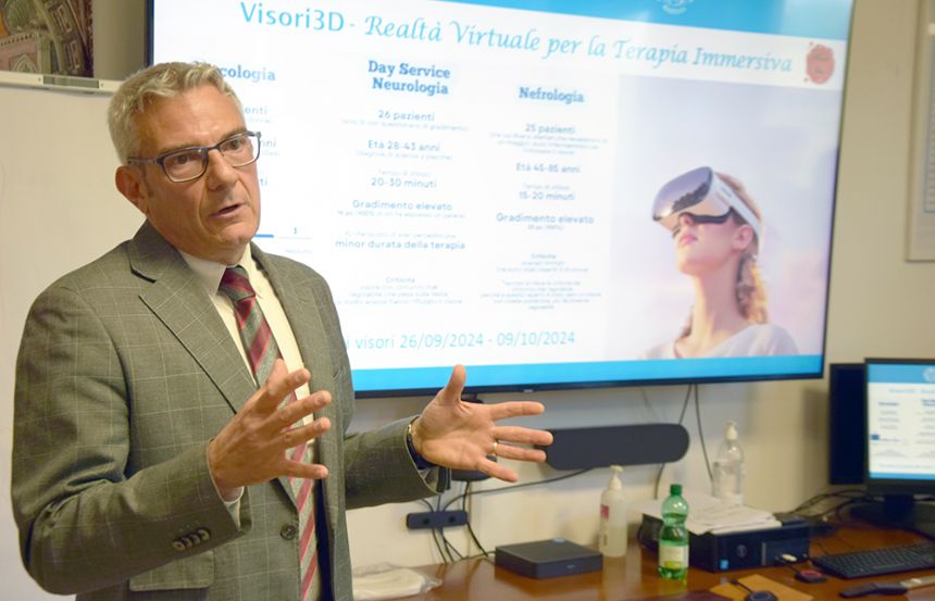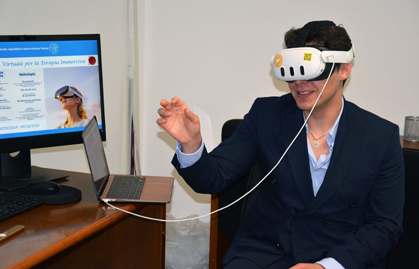 Ridurre i sintomi di ansia, stress e dolore attraverso la terapia immersiva, offrendo un'esperienza multisensoriale che stimola positivamente l'emotività del paziente e allevia lo stress psicologico. Questo l’obiettivo principale di “Visori 3D”. progetto di realtà virtuale per la terapia immersiva che prende il via all’Azienda ospedaliero-universitaria Senese. L’iniziativa è stata presentata in conferenza stampa, e ha visto una fase di sperimentazione negli scorsi mesi, coordinata dall’Ufficio innovazione in ambito ICT, che si è svolta nei reparti di Oncologia medica, nel Day service di Neurologia e in Nefrologia. «Il progetto si inserisce nei nostri percorsi di umanizzazione delle cure – afferma il professor Antonio Barretta, direttore generale dell’Aou Senese – e permetterà di ottenere una percezione dei tempi di cura inferiore da parte dei pazienti, con la fruizione di contenuti multimediali che saranno disponibili con i visori, grazie anche alla preziosa collaborazione di associazioni del nostro territorio, come l’Associazione Culturale La Sveglia».