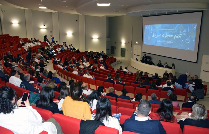 Un’intensa mattinata all’Azienda ospedaliero-universitaria Senese, in occasione degli auguri di Natale organizzati dalla direzione aziendale. L’evento si è aperto con il saluto al personale che è andato in quiescenza nel 2024, con un omaggio da parte dell’Aou Senese ed i commossi ricordi dei tanti anni passati all’interno dell’ospedale da parte dei dipendenti che hanno raggiunto la pensione in questo anno solare. Successivamente tutto il personale dell’Aou Senese si è ritrovato nell’aula Magna del centro didattico per scambiarsi gli auguri. Il saluto iniziale è stato a cura del rettore dell’Università di Siena, Roberto Di Pietra, seguito dal professor Antonio Barretta, direttore generale dell’Aou Senese.
