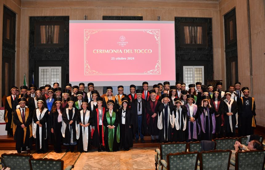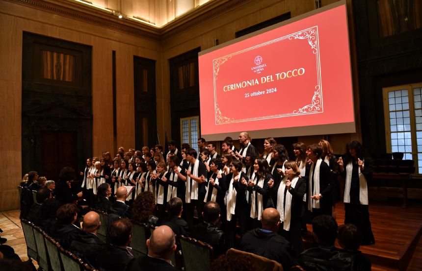 La “Cerimonia del tòcco”, momento di accoglienza e festeggiamento dei nuovi docenti dell’Università di Siena che nell’ultimo anno sono entrati nei ruoli dell’Ateneo e di coloro che hanno ottenuto il passaggio di ruolo, si è tenuta il 25 ottobre nell’Aula Magna del palazzo del Rettorato a Siena. La cerimonia è stata aperta nel primo pomeriggio dal Coro di Ateneo, diretto dalla Professoressa Elisabetta Miraldi, che ha intonato il Gaudeamus Igitur, brani dal repertorio rinascimentale e tratti da popolari colonne sonore.