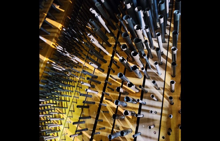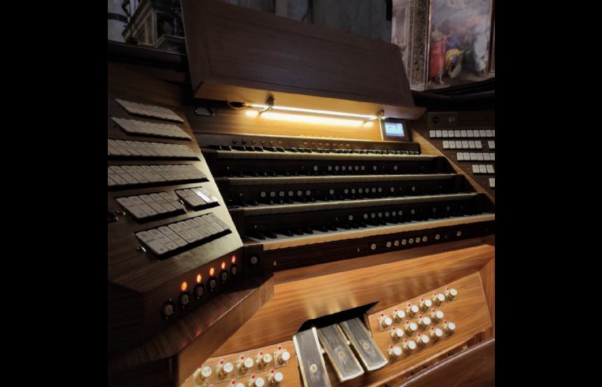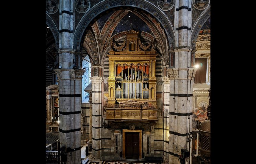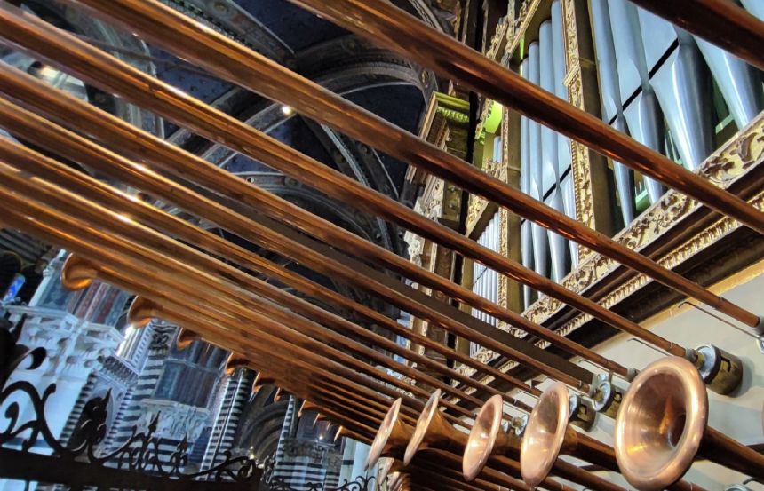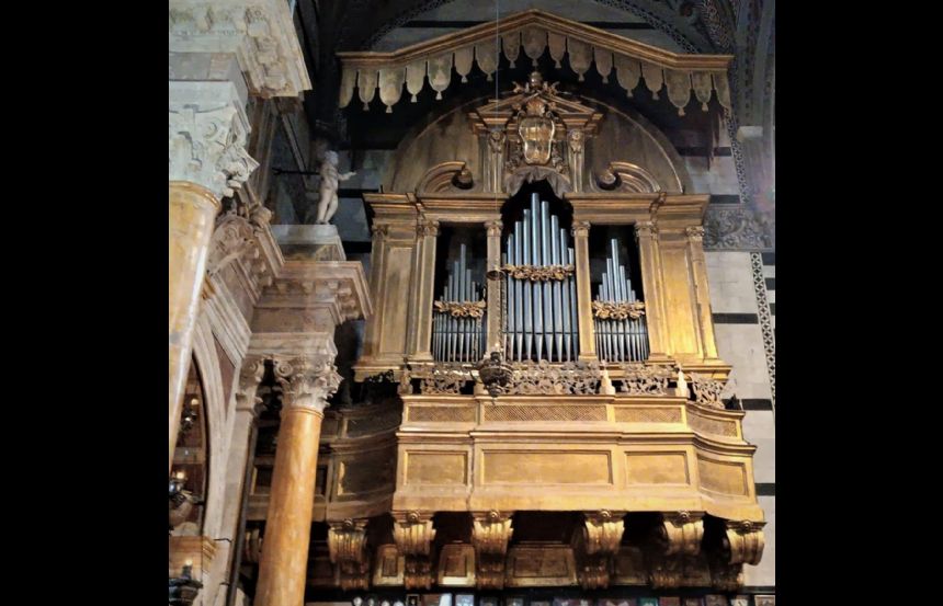 Di solito si usa dire “l’organo della Cattedrale”. In realtà, per dare un’idea della grandiosità e della complessità di questo enorme strumento si dovrebbe usare il plurale, cioè “gli organi”. Fino al secondo dopoguerra, infatti, esistevano in Cattedrale ben tre distinti strumenti, dei quali il maggiore, collocato sopra la sacrestia, risaliva addirittura al 1508, con aggiunte che si erano protratte fino all’Ottocento, mentre gli altri due si trovavano rispettivamente l’uno esattamente di fronte all’organo grande e l’altro, di origine barocca romana, accanto alla Cappella del Voto. Fu a partire dal 1958, attraverso una serie di tappe conclusesi nel 1977, che su iniziativa dell’allora organista titolare Giordano Giustarini non solo i tre organi furono ulteriormente ampliati e riuniti tra di loro tramite l’elettrificazione dei comandi di trasmissione, ma se ne aggiunse addirittura un quarto dietro all’altar maggiore, tanto da giungere alla configurazione attuale, che vede ben quattro corpi di canne distinti, azionabili tramite una consolle centrale a quattro tastiere. La trasmissione dei comandi si avvale di un sistema radiocomandato.