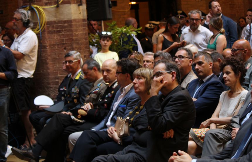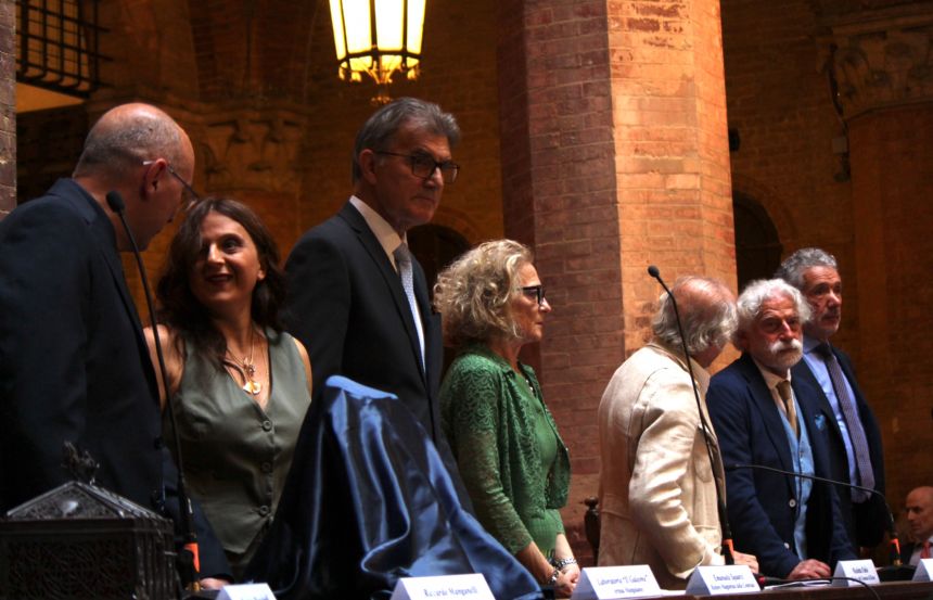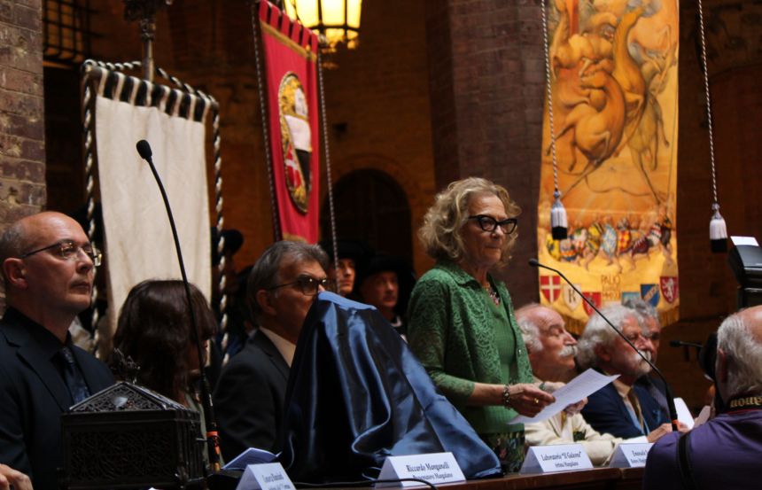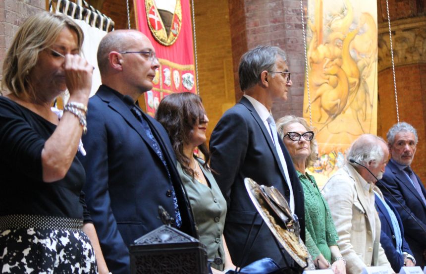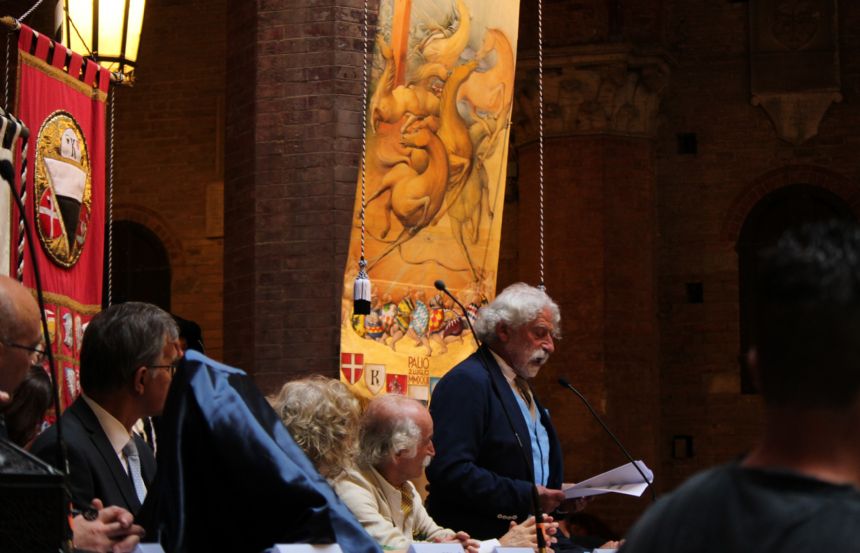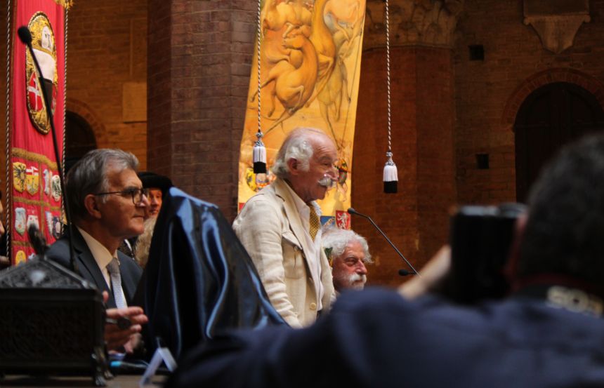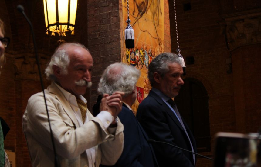 Poi la volta del maestro Di Jullo, visivamente emozionato. “In un contesto così delicato, ricco di tradizione, ricco di umanità e di quello che serve per avere fede nel Palio, sono contento di aver condiviso questo con voi senesi. Il mio Palio l'ho dipinto per voi”. Ha poi aggiunto: “E' il mio contributo alla vostra straordinaria storia, millenaria. Ho steso ogni singola pennellata con la passione e il rispetto e la devozione per un impegno professionale di una così grande importanza”.
