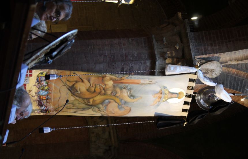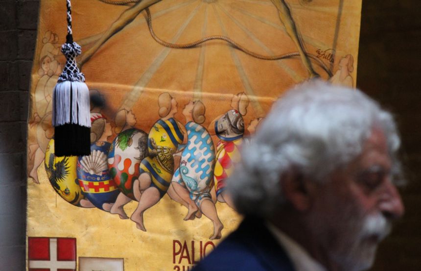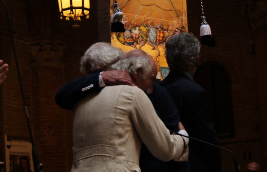 “Danzano i cavalli nei suoi quadri”, ha poi aggiunto Duccio Balestracci, che ha minuziosamente presentato l'opera dell'artista. “Al centro lo slancio dei cavalli supera il canape in caduta reso tridimensionale dal gioco dei chiari e degli scuri e si getta nella corsa che però non allude scontatamente ai tre giri di piazza perchè le figure si godono, in maniera centrifuga insofferenti dello spazio nel quale sembrano essere costretti e si slanciano a sfondare le linee di confine del drappellone, trasformando il momento immanente nella proiezione di un altrove di assolutezza”.