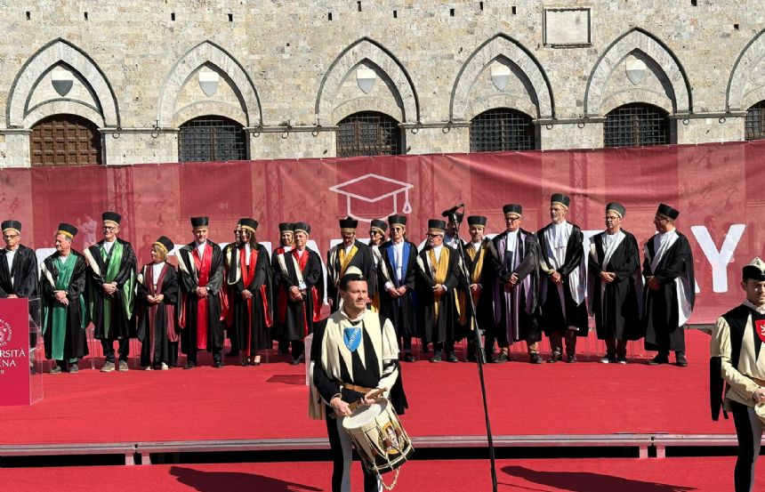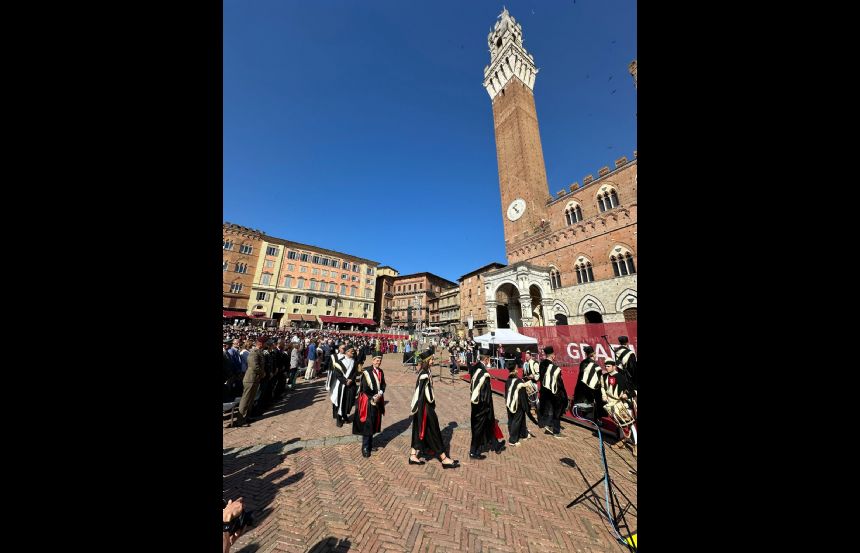 Un pomeriggio ritmato da interventi che hanno scandito il giorno della festa di laurea per quasi 800 partecipanti e per i loro familiari. La cerimonia è iniziata alle ore 17 nella splendida cornice della Piazza del Campo. Il corteo accademico ha fatto il suo ingresso in piazza uscendo dal palazzo comunale; grande l’emozione al suono delle chiarine che hanno dato l’avvio all’evento. Quindi il Rettore e le Direttrici e Direttori dei Dipartimenti universitari hanno preso posto sul palco.