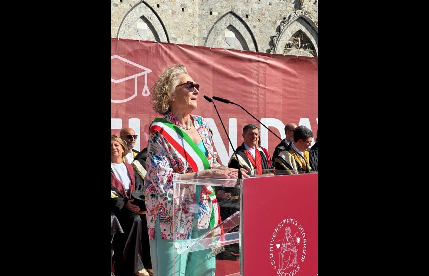 Ha preso quindi la parola il Sindaco di Siena Nicoletta Fabio: “Un saluto al Magnifico Rettore, autorità, docenti, cittadini e ovviamente, con un calore diverso e partecipato, a tutte queste ragazze e a questi ragazzi presenti oggi in Piazza del Campo, ai loro genitori e alle loro famiglie. Quello che vorrei restasse nelle loro memorie e quello su cui maggiormente dobbiamo lavorare tutti, istituzioni in primis, è il concetto dell’accoglienza. Vorrei che Siena riuscisse nel tempo a restare legata sempre a questo valore così importante, soprattutto oggi. Studiare in questa città, vuol dire viverla, essere partecipi delle azioni quotidiane di una comunità che da sempre può rivendicare una forte composizione identitaria. Ma questo non vuol dire che non possa esserci spazio per chi in questa città non ci è nato. La voce dei nostri giovani, tutti, deve essere ascoltata sempre. Cercare di costruire con loro un futuro che possa in alcuni casi permettergli di continuare a considerare la nostra città come una seconda casa credo sia l’obiettivo più grande”.