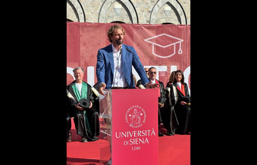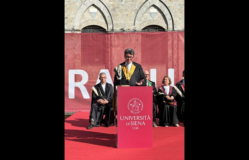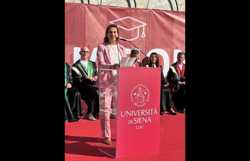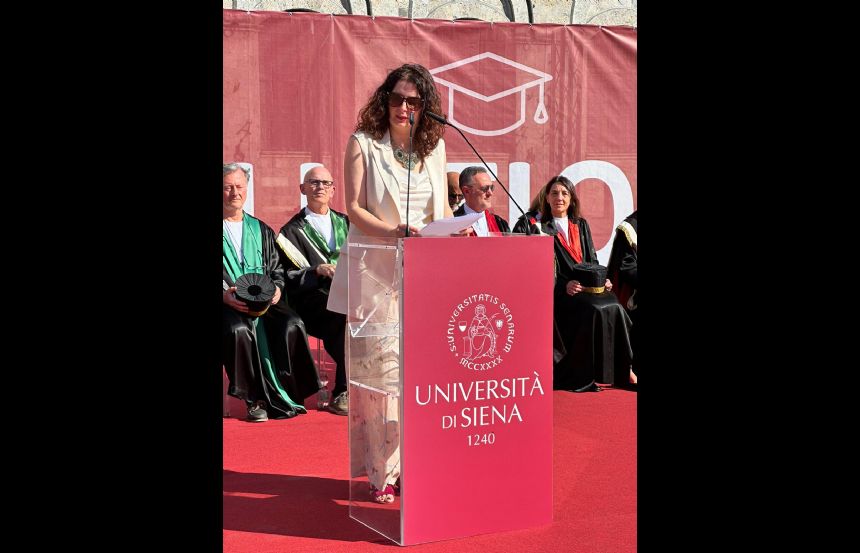 Ha preso quindi la parola la Vice Presidente dell’Associazione USiena Alumni Chiara Galgani; Siena, solidarietà, sacrificio e sogno sono state le parole chiave del suo intervento: “Questo giorno rappresenta la sintesi di anni di sacrificio, impegno e perseveranza. E deve essere un momento di gioia e gratitudine. Come voi, anch’io ho percorso un lungo cammino di studio e di sacrificio per conseguire la laurea in questa autorevole Istituzione. Come voi, alla conclusione di questo percorso, ho compreso l’importanza del traguardo raggiunto, ma ho anche avvertito la consapevolezza di essere di fronte a un nuovo inizio. Come voi oggi, ho provato un alternarsi di emozioni: felicità, soddisfazione, orgoglio unite ad apprensione per il futuro e a un forte desiderio di realizzazione personale e professionale. In altre parole, questa cerimonia non segna un punto di arrivo, ma rappresenta per voi un punto di partenza. L’inizio di un cammino fatto di nuovi progetti, cambiamenti, sfide, responsabilità e, vi auguro, di successo”.