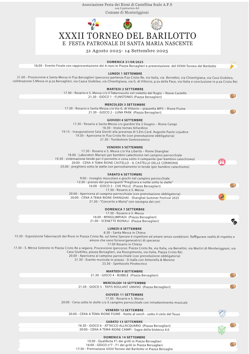 Dal 31 agosto al 14 settembre, a Castellina Scalo (Monteriggioni -SI), si svolgerà la XXXII edizione del Torneo del Barilotto e Festa patronale di Santa Maria Nascente.