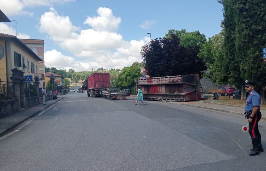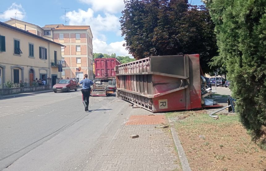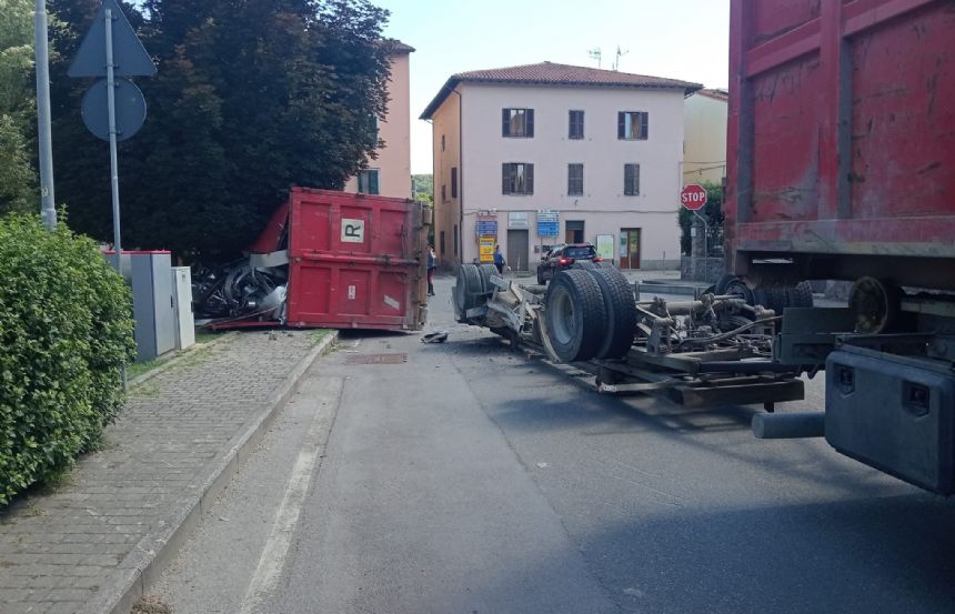 Tragedia sfiorata stamattina poco dopo le ore 11.00: motrice e rimorchio carichi di materiale metallico si sono ribaltati a Staggia senese all'incrocio via Romana-via della Pace.