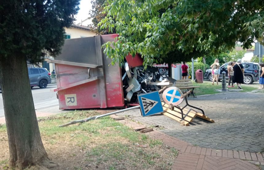 Fortunatamente sono incolumi anche se spaventati, gli anziani seduti sulle panchine di fronte a quelle divelte dal rimorchio ribaltato.