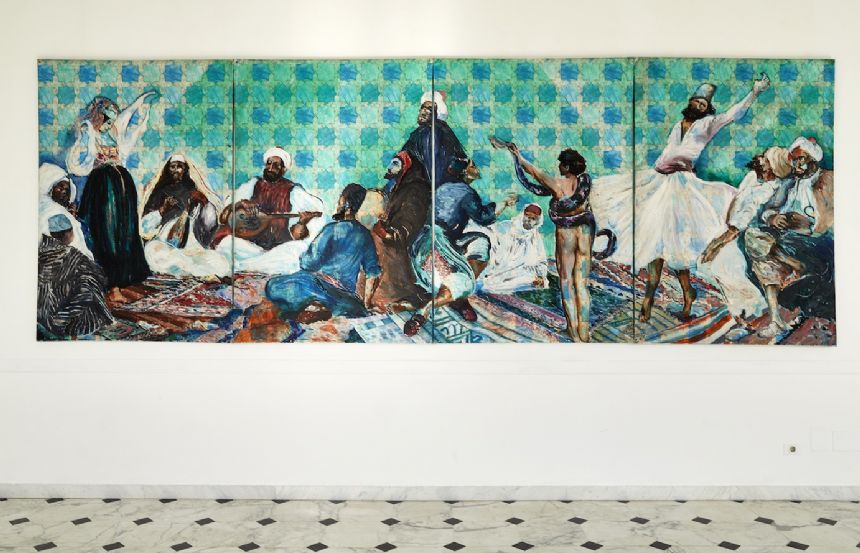 Un tema arabo, nato intorno alla metà degli anni Ottanta, che si ritrova nelle figure che si muovono in uno spazio immaginario: donne algerine, ebrei di Costantina, mercanti, questi ultimi, raffigurati tra la seconda metà degli anni novanta e il 2001 e visti in Marocco. Sono ritratti esotici di uomini in abiti tradizionali che espongono la loro merce, lana, mollette e souvenir vari, intensi fotogrammi che ci portano in un mondo e in abitudini di vita completamente diverse dalle nostre. I dervisci, invece, danzano in una preghiera collettiva che li porta a levitare nell’aria, in un abbraccio ideale avvolto dalla spiritualità, accanto ai rabbini, i maestri, i saggi, che tanto hanno affascinato l’artista. E nei viaggi di Mondino non poteva mancare la città del Palio a cui è dedicata “Siena”, un grande dittico del 1991 che rappresenta l’amore per la città che lo ha accolto in più di un’occasione. “La parola, il segno, si fanno linguaggio pittorico, poetico, evocativo. I cavalli scalpitano alla partenza, le zampe allineate sono sospese in un tempo senza fine”, racconta Vittoria Coen.