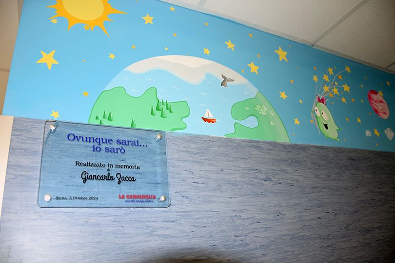 Un immaginario viaggio del nipote insieme a suo nonno, alla scoperta di un universo fantastico ed inesplorato. È la storia che si trova sulle pareti della stanza “Fantasia” inaugurata nel reparto di Chirurgia pediatrica dell’Azienda ospedaliero-universitaria Senese, diretto dal professor Mario Messina. La camera, affrescata dai disegni realizzati da Elisa Baldassano, vuole essere un omaggio alla memoria di Giancarlo Zucca, membro del consiglio dell’Associazione La Conchiglia-Amici della Chirurgia pediatrica ed è stata realizzata grazie al contributo dell’associazione.