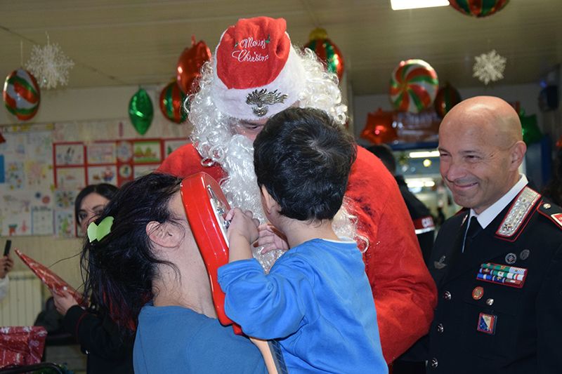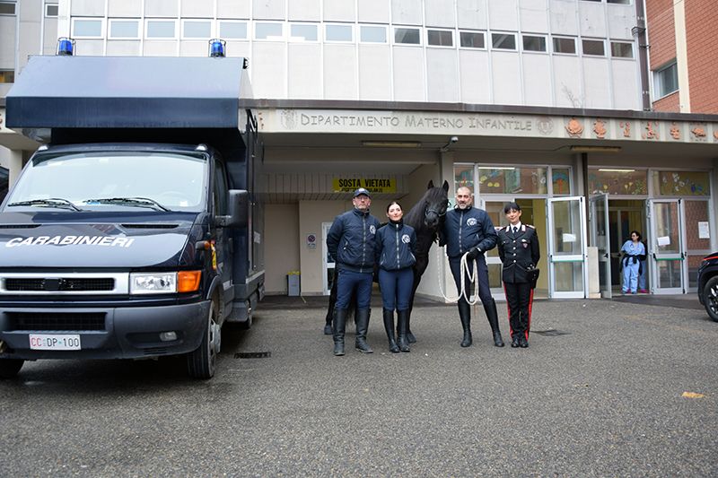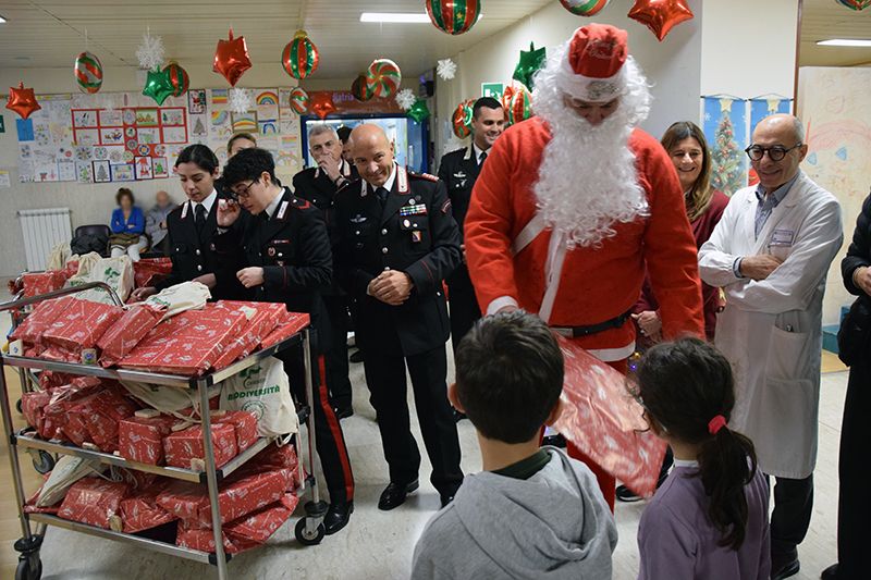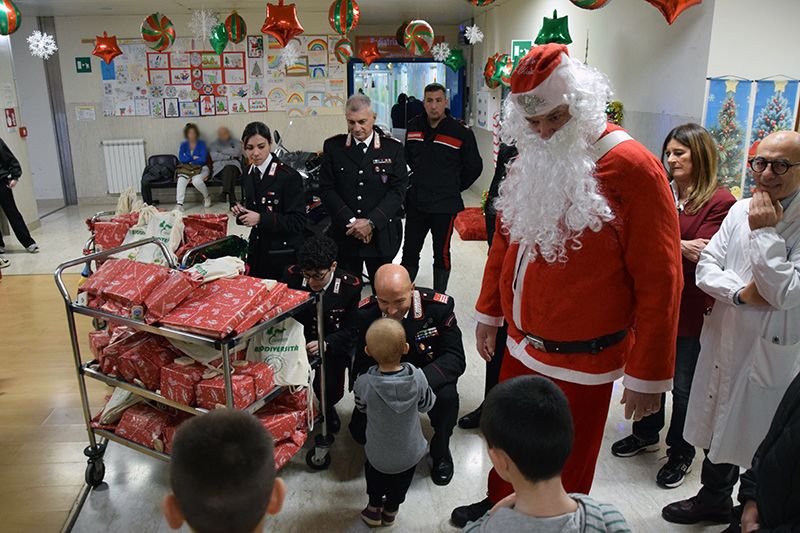 Una piacevole tradizione delle festività all’Azienda ospedaliero-universitaria Senese, una bellissima sorpresa per i bambini e le bambine ricoverate alle Scotte. Anche nel 2025, il Babbo Natale dell’Arma dei Carabinieri non ha mancato di far visita all’ospedale di Siena per portare regali e sorrisi ai piccoli pazienti del Dipartimento della Donna e dei bambini e della Neuropsichiatria infantile. Presente anche uno splendido esemplare di Cavallino di Monterufoli, portato alle Scotte dal Reparto biodiversità di Siena del Gruppo Carabinieri forestale. L’iniziativa è stata organizzata dal Comando provinciale dei Carabinieri di Siena che ha provveduto a consegnare doni e tante sorprese per i piccoli pazienti dell’ospedale Santa Maria alle Scotte. Nell’occasione, l’Arma era rappresentata dal comandante provinciale, il colonnello Giulio Modesti, accompagnato da numerosi militari e anche da alcuni mezzi usati quotidianamente, come le moto di ordinanza, su cui le bambine e i bambini sono saliti per un momento di allegria. Per l’Azienda ospedaliero-universitaria Senese presenti il direttore generale Antonio Barretta, la direttrice sanitaria Maria De Marco, insieme a numerosi direttori di unità operativa e altri professionisti dei vari reparti del Dipartimento della Donna e dei Bambini e anche della Neuropsichiatria infantile.