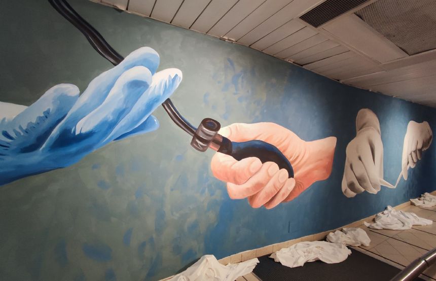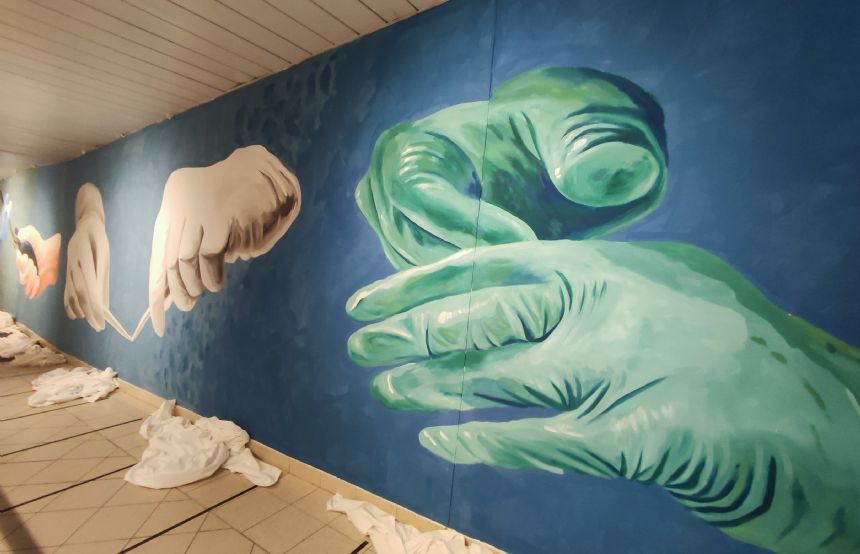 Il murale di 87 mq circa è un racconto orizzontale dal significato semplice e immediato. Le mani compiono traiettorie utili, competenti, solidali, perfino eroiche, che sanno di dedizione e partecipazione costante e continua. Sono le mani di chi lavora in sanità. Si tratta, perciò, di un omaggio ai protagonisti della salvaguardia della nostra salute.